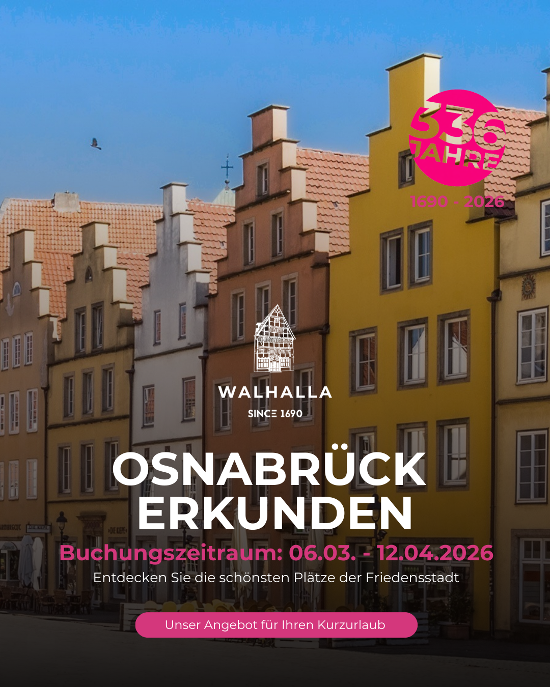 Das Walhalla, wie es von den Osnabrückern seit Jahrhunderten genannt wird, ist nicht nur ein Romantik Hotel & Restaurant Mitglied, sondern Osnabrücks ältestes bestehendes Gasthaus. Mit 69 Zimmern und Suiten, Tagungsräumen, kleinem Wellnessbereich und 3 Restaurants gehört das Walhalla noch zu den wenigen Privathotels unserer Stadt. Seien Sie bei uns herzlich Willkommen.